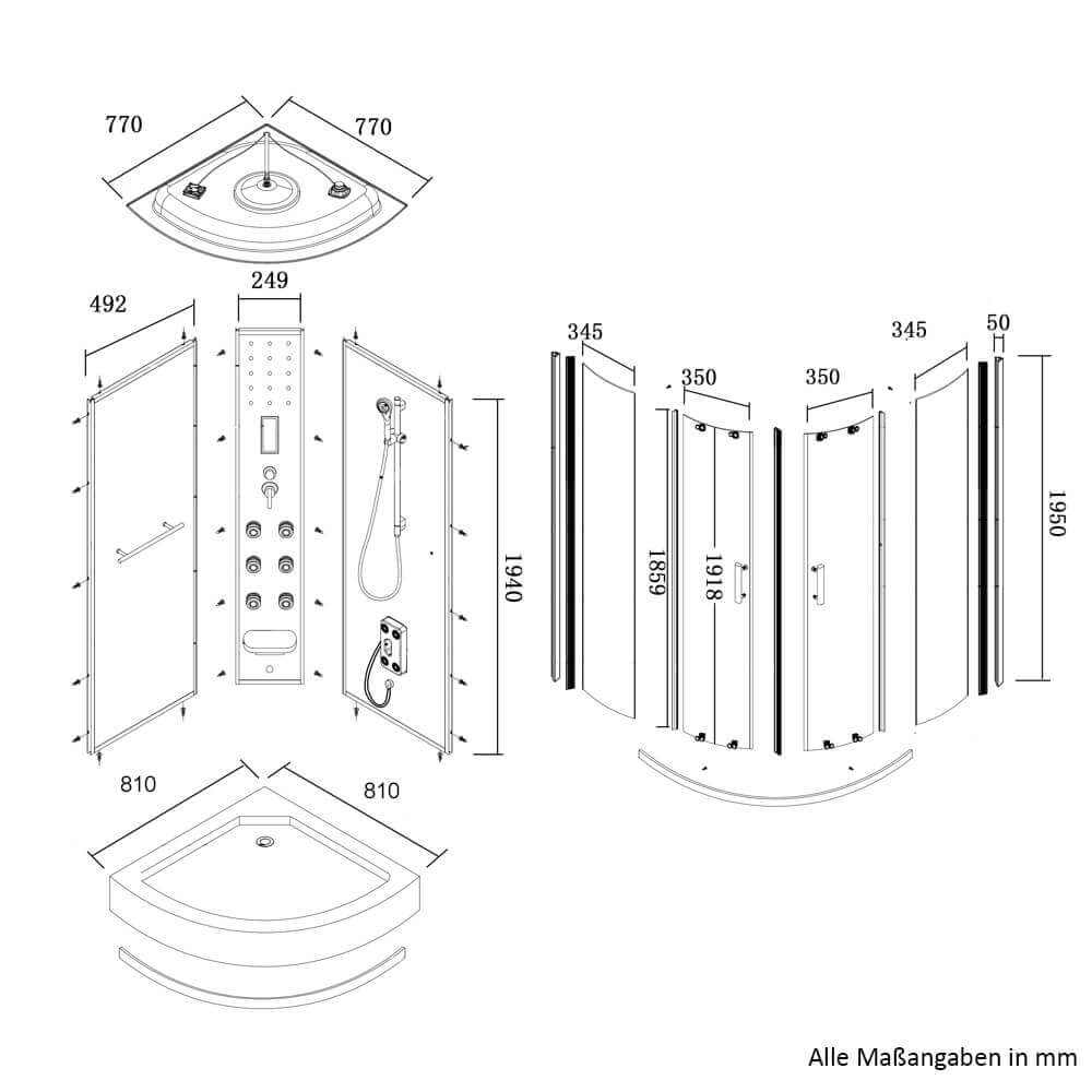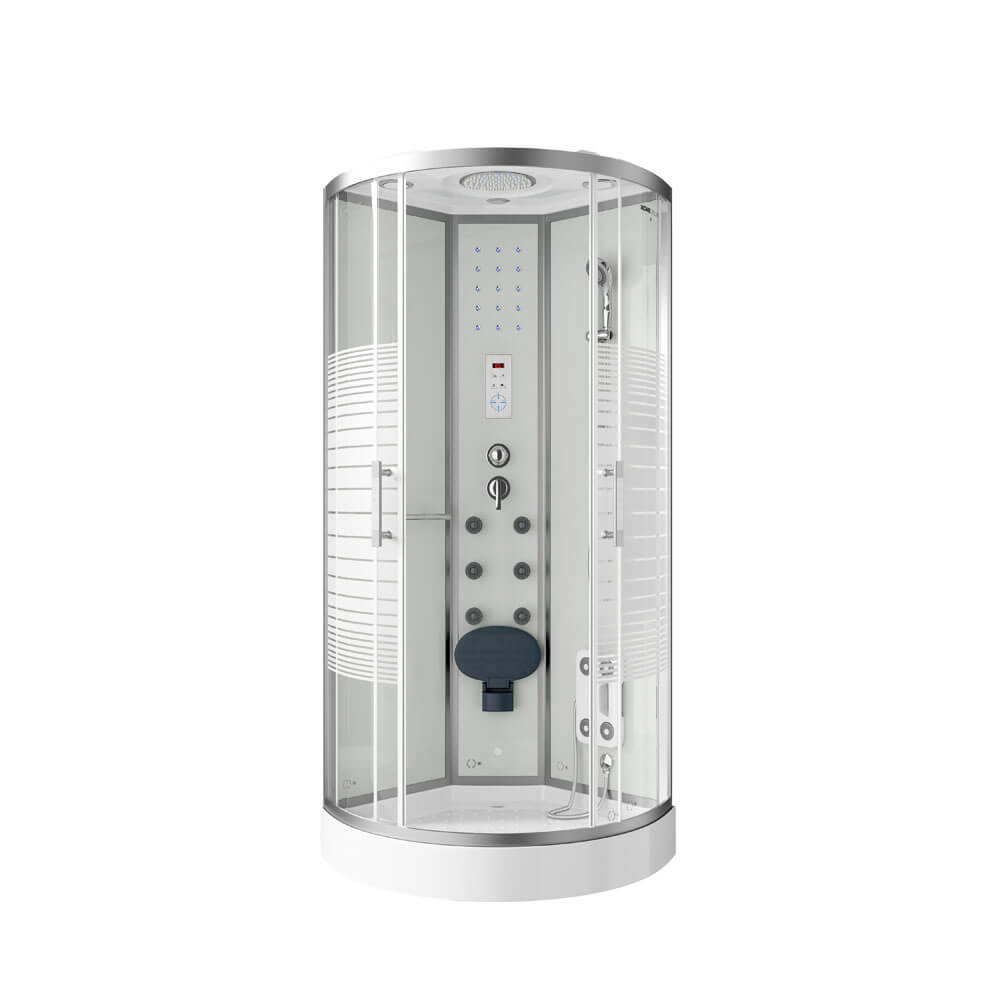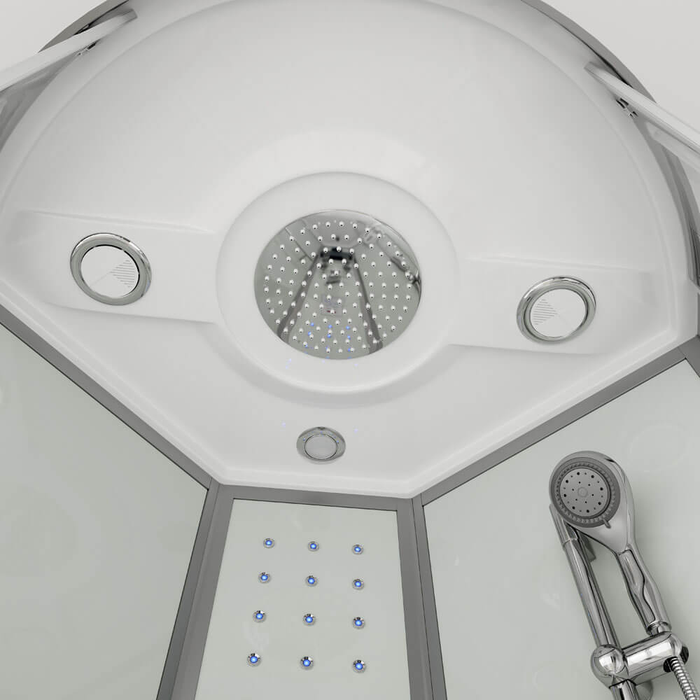 Naše „série PEARL“ vám nabízí možnost dešťové sprchy, ve které voda stéká jako vlažný tropický déšť z neuvěřitelných 126 trysek na stropní obloze. Relaxační masáž zad (6 hydrotrysek) při poslechu oblíbené rozhlasové stanice je oblíbená u mnoha zákazníků. Samozřejmostí je také běžné použití s ruční sprchou, kterou lze nastavit pomocí přiložené sprchové tyče. Ruční sprcha má 3 různé verze proudu, takže sílu proudu můžete nastavit dle potřeby. 15 modrých LED světel ve středním panelu doplňuje „faktor dobrého pocitu“. Pomocí integrovaného displeje počítače můžete plynule upravovat hlasitost a výběr stanice. Sklopné sedátko ve středovém panelu a protiskluzová konstrukce na dně vaničky zajišťují bezpečné používání tohoto sprchového koutu. 5 mm ESG plné zasklení všech komponentů a ultramoderní částečně saténový povrch představují náš trvale vysoký standard kvality. Výškově nastavitelné nožičky sprchové vaničky, které lze přizpůsobit téměř jakémukoli povrchu, jsou další výjimečnou vlastností, která odlišuje tento sprchový kout od ostatních.