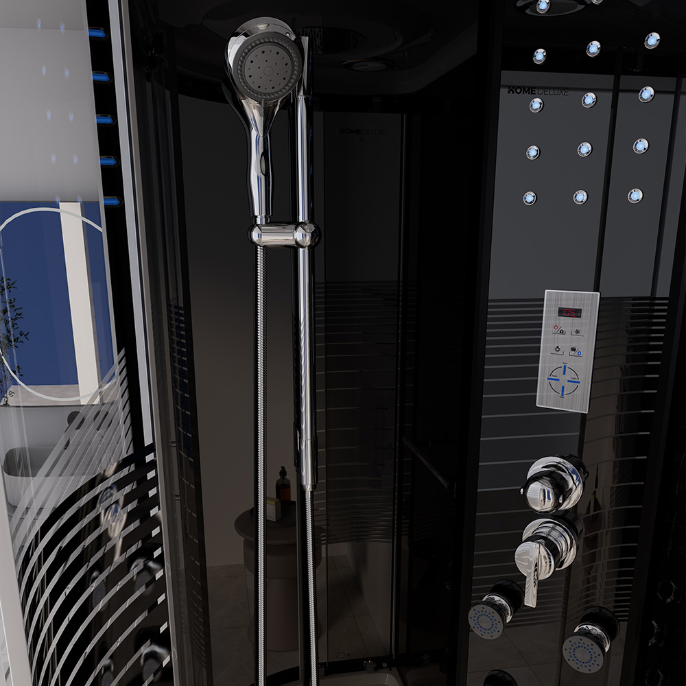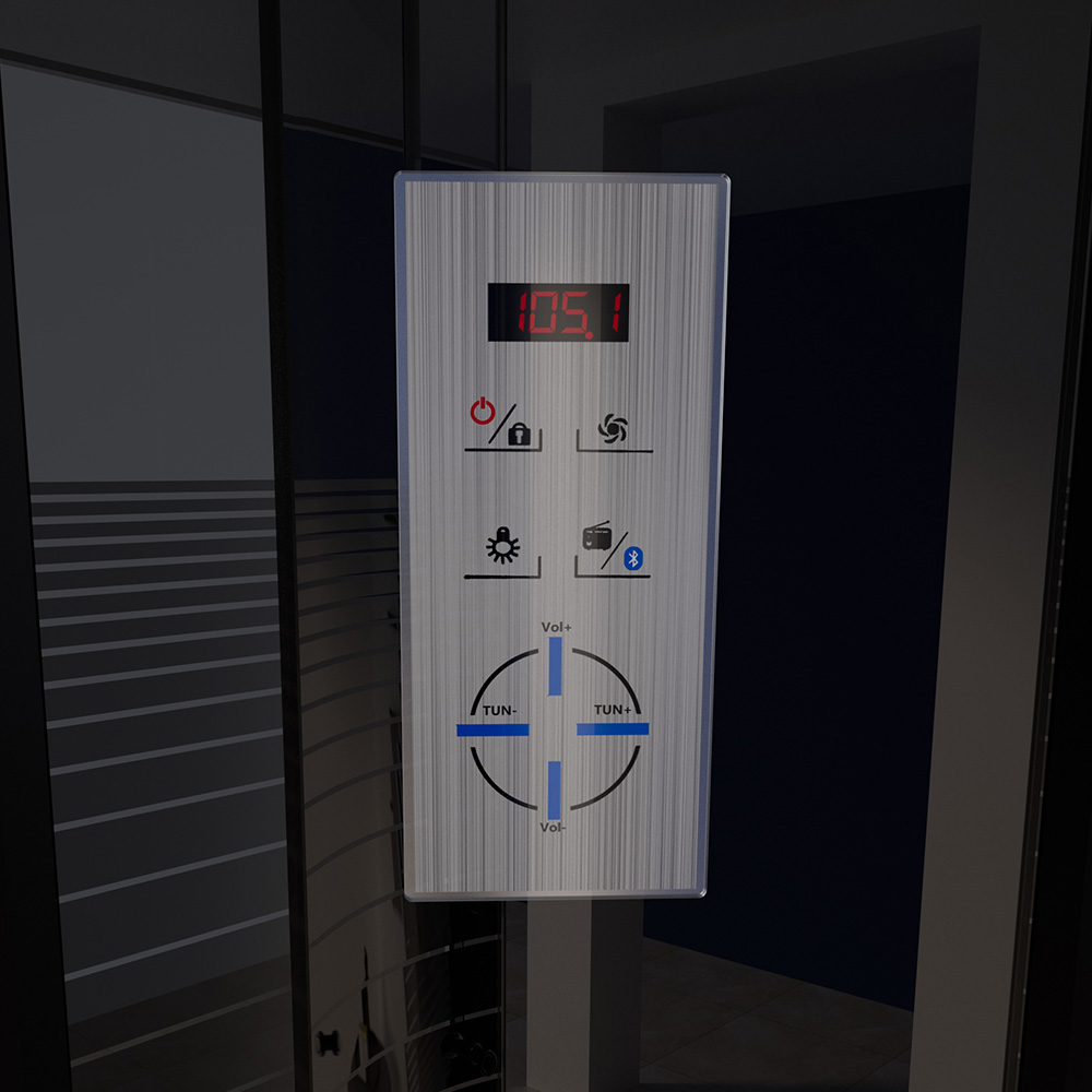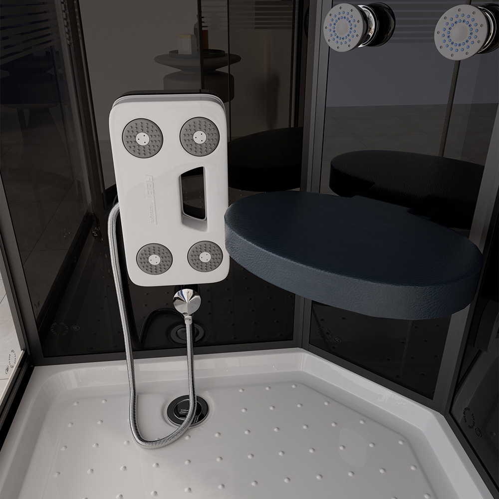 Naše „série PEARL“ vám nabízí možnost dažďové sprchy, ve které voda stéká jako vlažný tropický dážď z neuvěřitelných 126 trysek na stropní obloze. Relaxační masáž zad (6 hydrotrysek) při poslechu oblíbené rozhlasové stanice je oblíbená u mnoha zákazníků. Samozřejmostí je také běžné použití s ruční sprchou, kterou lze nastavit pomocí přiložené sprchové tyče. Ruční sprcha má 3 různé verze proudu, takže sílu proudu můžete nastavit dle potřeby. 15 modrých LED světel ve středním panelu doplňuje „faktor dobrého pocitu“. Pomocí integrovaného displeje počítače můžete plynule upravovat hlasitost a výběr stanice. Sklopné sedátko ve středovém panelu a protiskluzová konstrukce na dně vaničky zajišťují bezpečné používání tohoto sprchového koutu. 5 mm ESG plné zasklení všech komponentů a ultramoderní částečně saténový povrch představují náš trvale vysoký standard kvality. Výškově nastavitelné nožičky sprchové vaničky, které lze přizpůsobit téměř jakémukoli povrchu, jsou další výjimečnou vlastností, která odlišuje tento sprchový kout od ostatních.