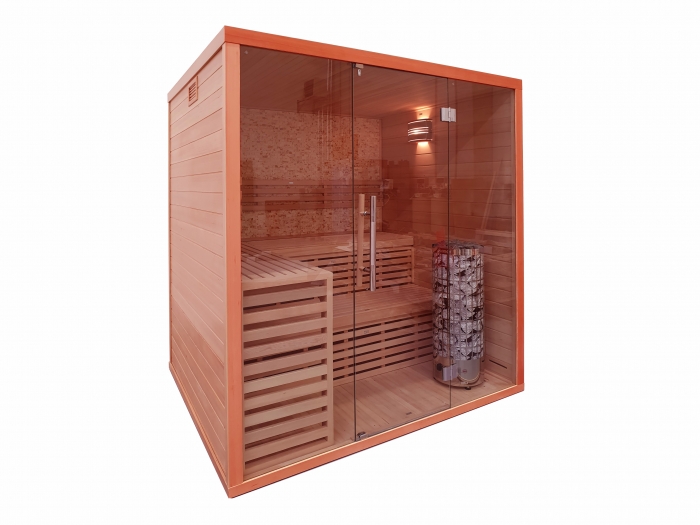 Moderní finská sauna Nordic o rozměrech 1800x1500x2100mm maximálně pro 3 – 4 osoby je vyrobena z kvalitního dřeva kanadské borovice hemlock, zadní stěna je vyrobena z křemence. Výhodou je snadné a rychlé sestavení a velká prosklená část, která působí vzdušně a elegantně. Sauna se umístí do místnosti vždy tak, aby pro účel větrání měla odstup 30-50 mm od nejbližší stěny. Není určena pro komerční a zátěžové provozy. V horní části sauny, kde už se vytváří vyšší teplota, je v panelech od výšky 1100mm a v celém stropním panelu minerální vata.