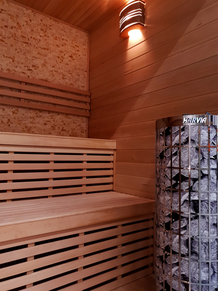 O vytápění sauny se starají saunová kamna Harvia Cilindro PC90, která mají tvar válcového koše, do kterého se vejde až 80 kg saunových kamenů. Nejen díky tomuto množství lze regulovat povahu saunování. Zaléváním konkrétní části kamen lze ovládat prudkost odpaření vody. Kameny v horní části pilíře se totiž zahřívají na vyšší teploty než v nižší části, což ovlivňuje rychlost a intenzitu odpařování. Saunová kamna jsou vyráběna výhradně z nerezavějících kovů. Tento model je vhodný k častějšímu zalévání vodou a jsou ovládány přímo na plášti.