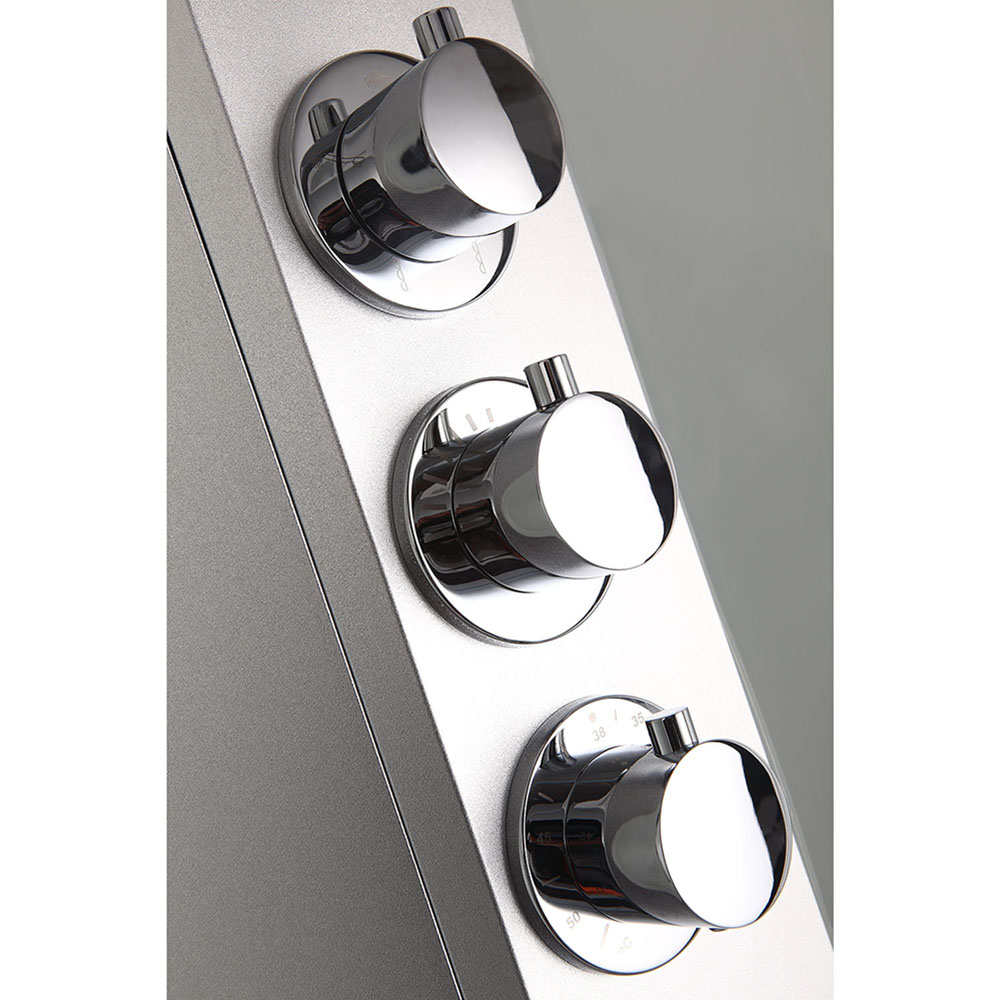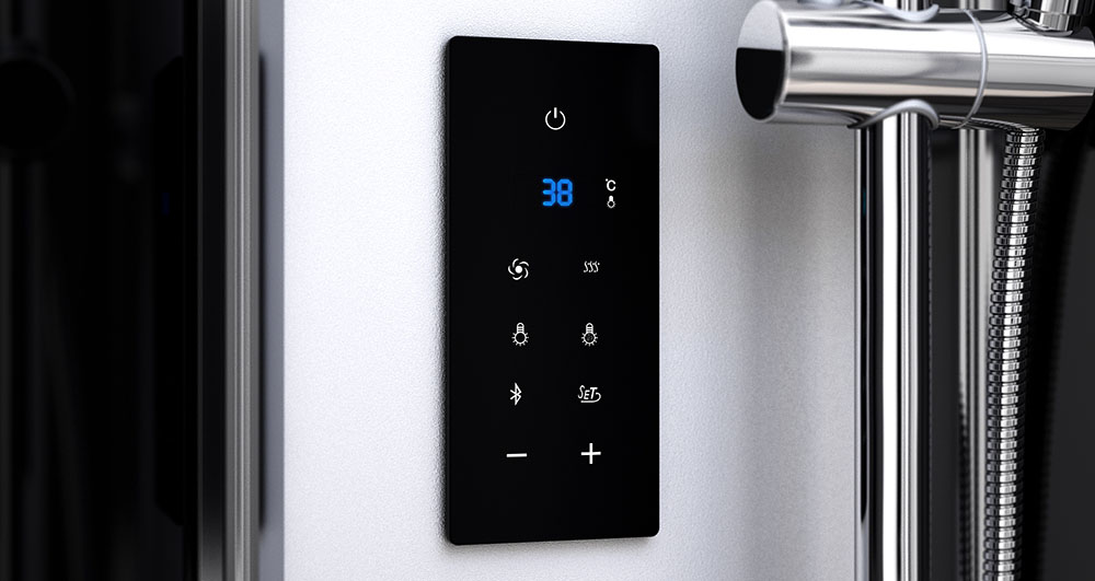 Ovládací panel je intuitivní a snadno se používá. Je vybaven dotykovými tlačítky a mnoha užitečnými funkcemi. Můžete měnit intenzitu světla (3 úrovně) a jeho barvu (7 typů). Pokud nechcete poslouchat rádio, můžete se k boxu připojit pomocí vestavěného Bluetooth a přehrávat hudbu z našeho oblíbeného playlistu z telefonu. Panel je vybaven také parním generátorem a funkcí spuštění ventilátoru. Pomocí teplotního čidla může panel zobrazovat aktuální teplotu v boxu. U parního generátoru lze nastavit, jak dlouho bude pracovat, a dokonce i to, na jakou teplotu bude box ohřívat.