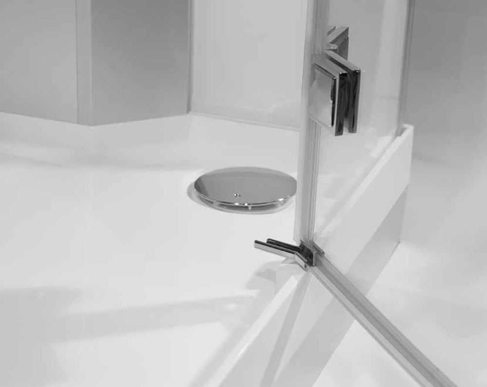 Skleněné stěny boxu, hliníkový držák, sprchová vanička a strop do sebe dokonale zapadají a vytvářejí kompaktní uzavřené těleso, které není třeba upevňovat ke stěně nebo podlaze. Minimální tloušťka stěn z minerálního mramoru a skla vytváří velký vnitřní prostor.
