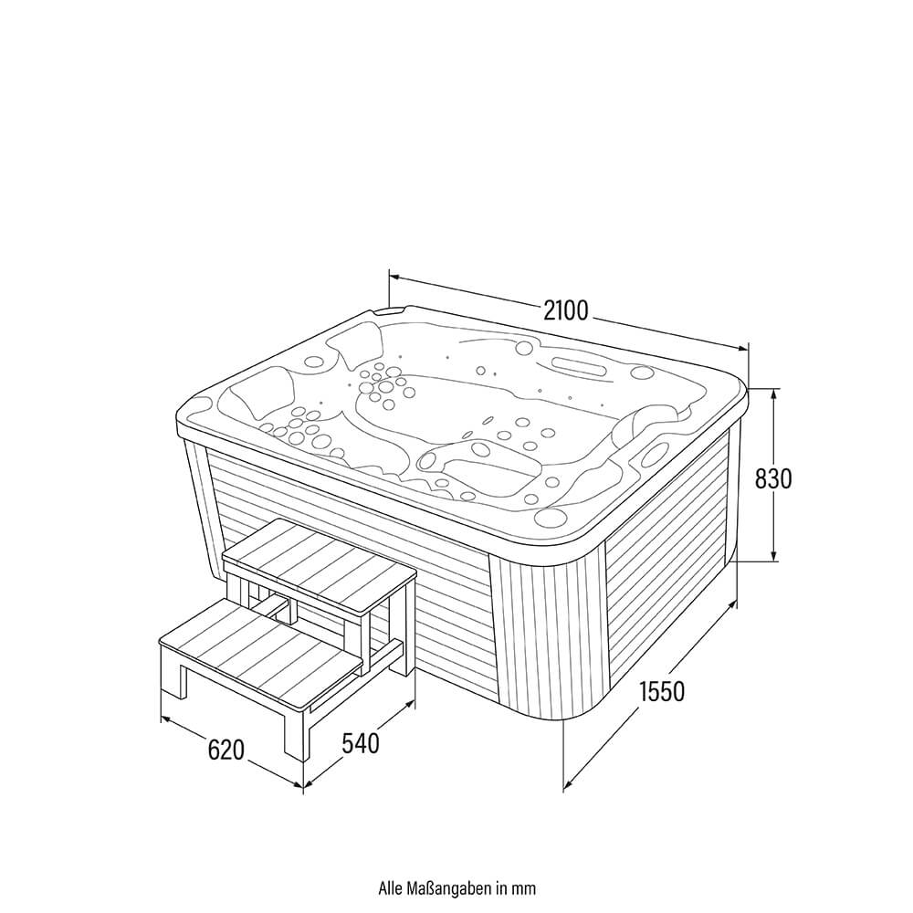 Po namáhavém dni se nechte hýčkat 51 masážními tryskami, které oživí vaše tělo i duši. Individuálně nastavitelná intenzita a směr trysky zajišťují personalizovaný zážitek. Kompaktní vířivka se perfektně hodí do vaší zahrady nebo na terasu a díky svému vysoce kvalitnímu designu a technologii je vizuálním lákadlem. 24 světelných zdrojů, které lze podle potřeby zapínat a vypínat, vytváří efekt barevné terapie a příjemnou atmosféru. Relaxujte nejen vsedě, ale také vleže díky pohodlným černým opěrkám hlavy.